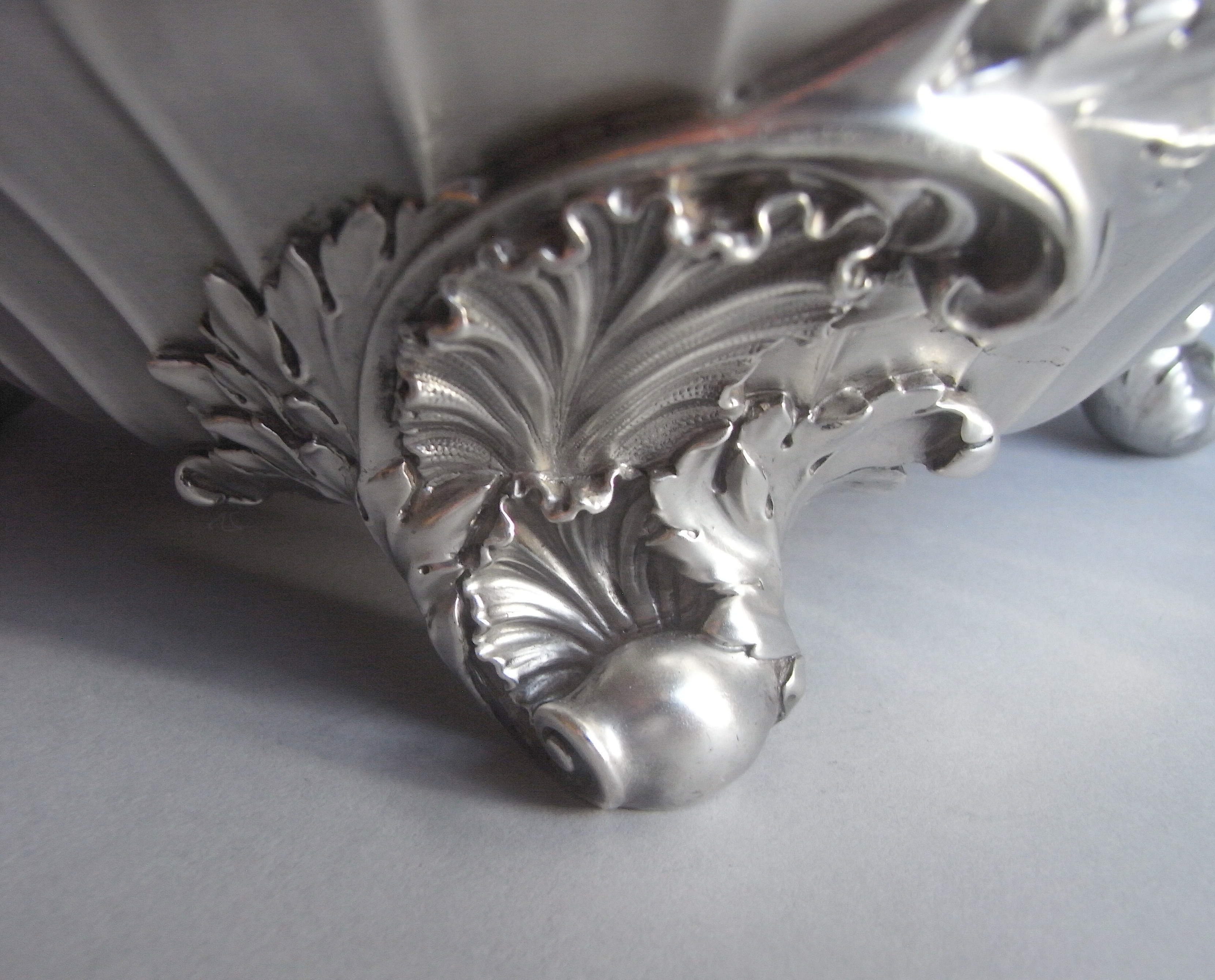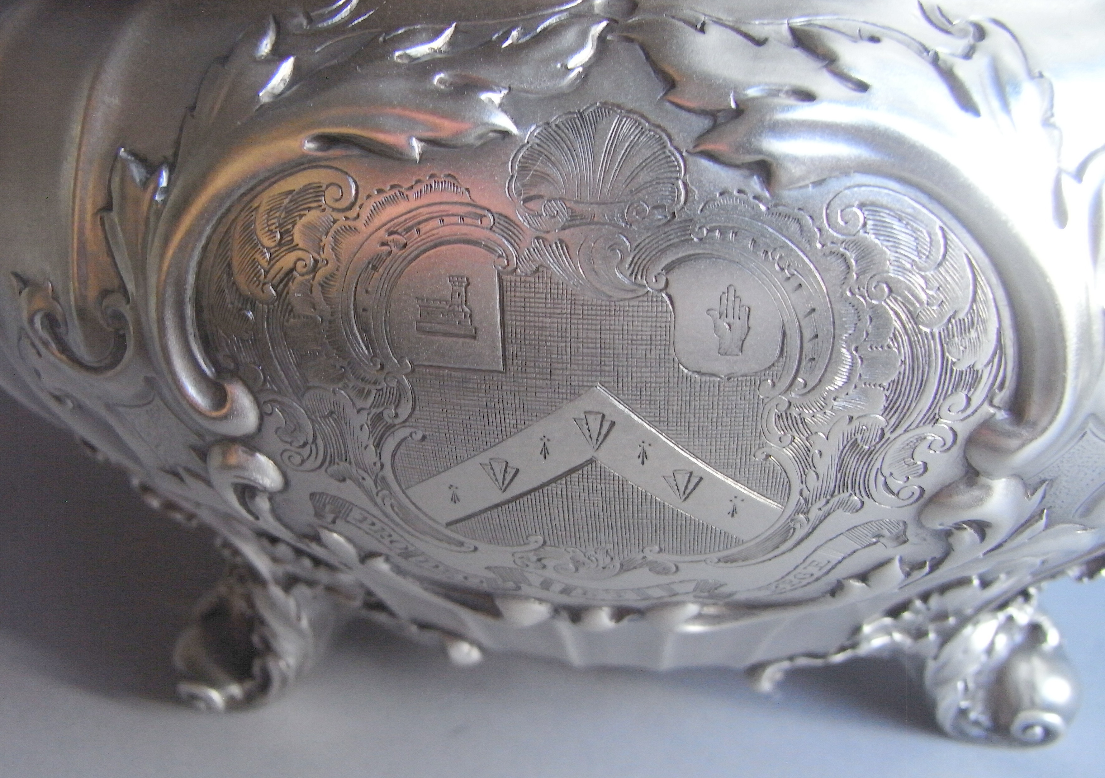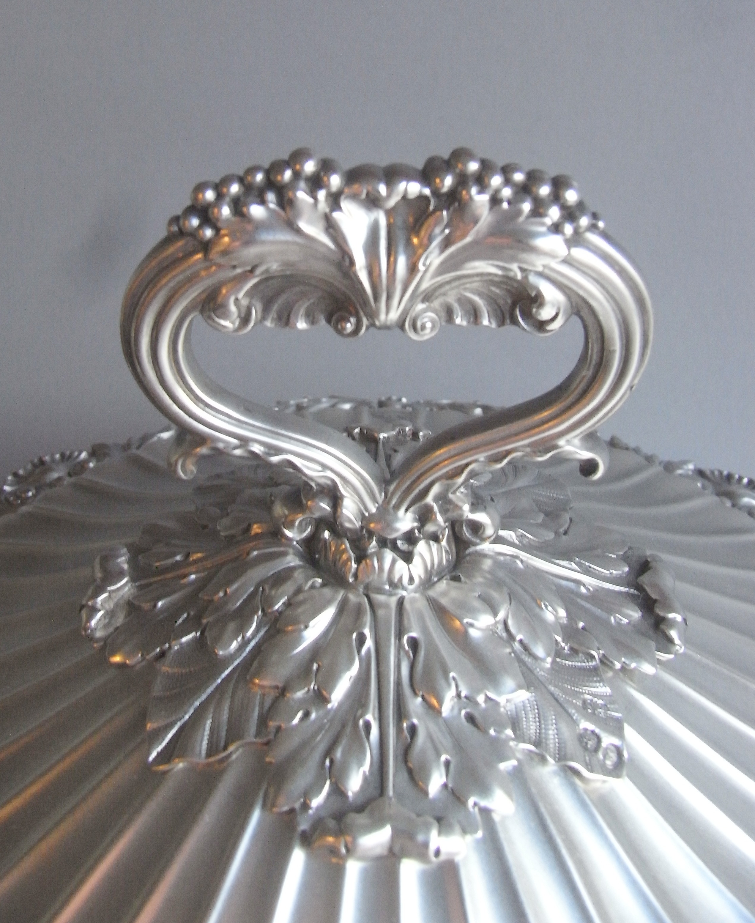 The Soup Tureen has a shaped circular form and stands on four scroll feet decorated with shells and displaying acanthus leaf mouldings where they are attached to the main body. The baluster shaped body is decorated with flat fluting and rises to an everted rim beautifully decorated with shells, acanthus scrolls and anthemion motifs. The bound, reeded, side handles also have acanthus mouldings and the front of the main body is engraved with a contemporary Armorial surrounded by a foliate scroll cartouche. The rear of the main body is also engraved with a contemporary Armorial. The conforming domed, pull-off, cover is also decorated with fluting and terminates in a reeded loop handle decorated with fruiting vines and shells. The handle sits on a platform of acanthus leaves in sizes. The cover is also engraved with two Crests. The Tureen is in excellent condition and is of the finest quality in design and production. It is of an exceptional weight and gauge.