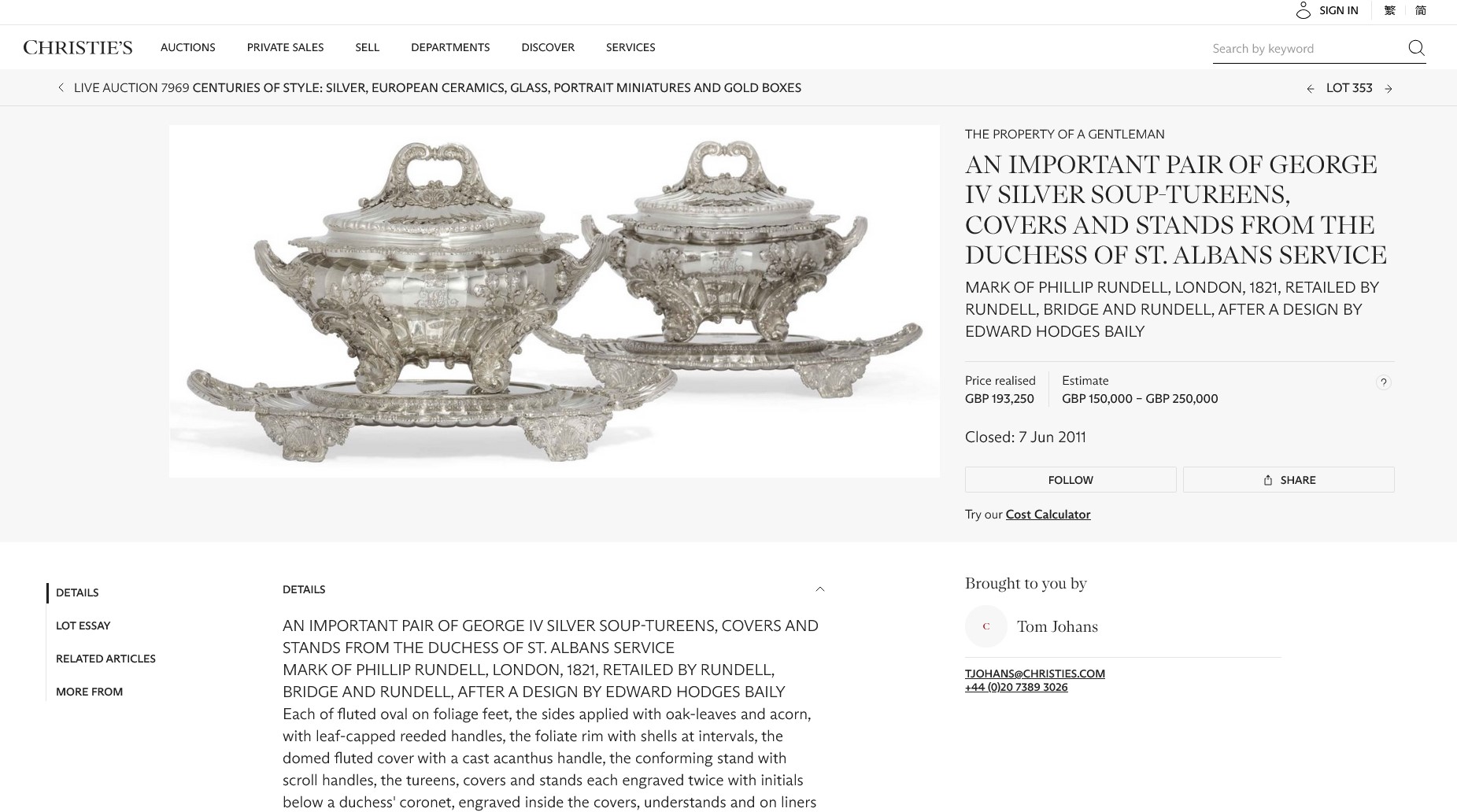 It is not often that we can attribute the design of a piece of silver to an individual, however this piece was almost certainly designed by Edward Hodges Baily, prominent sculptor who designed for Rundell’s and who designed Nelson’s column. He was also responsible for the design of the Duchess of St. Alban’s Soup Tureens on Stands, sold Christie’s 7th June 2011, and a near identical Soup Tureen which was sold at Christie’s on 17th May 2012. These are shown in the image stream.