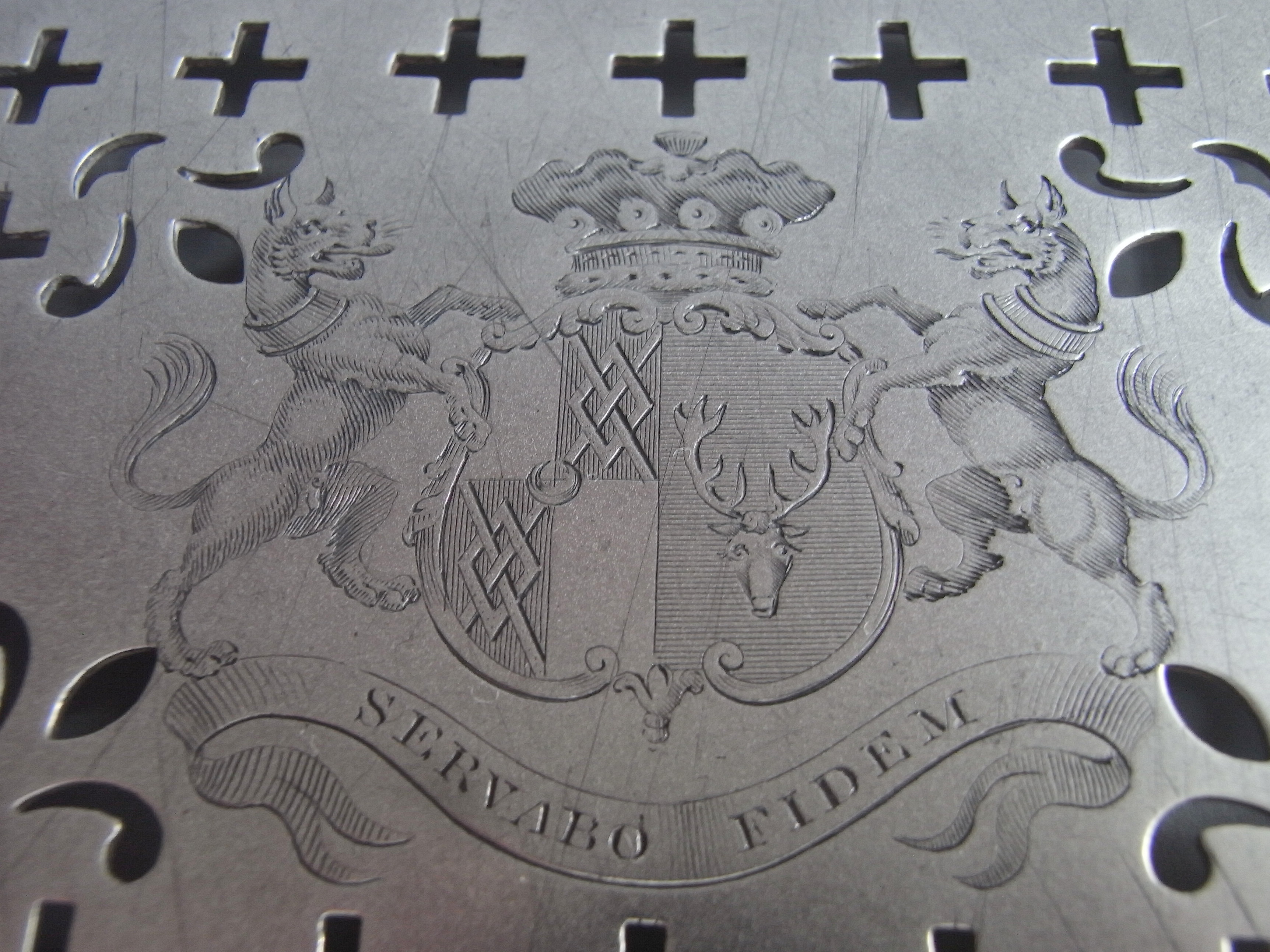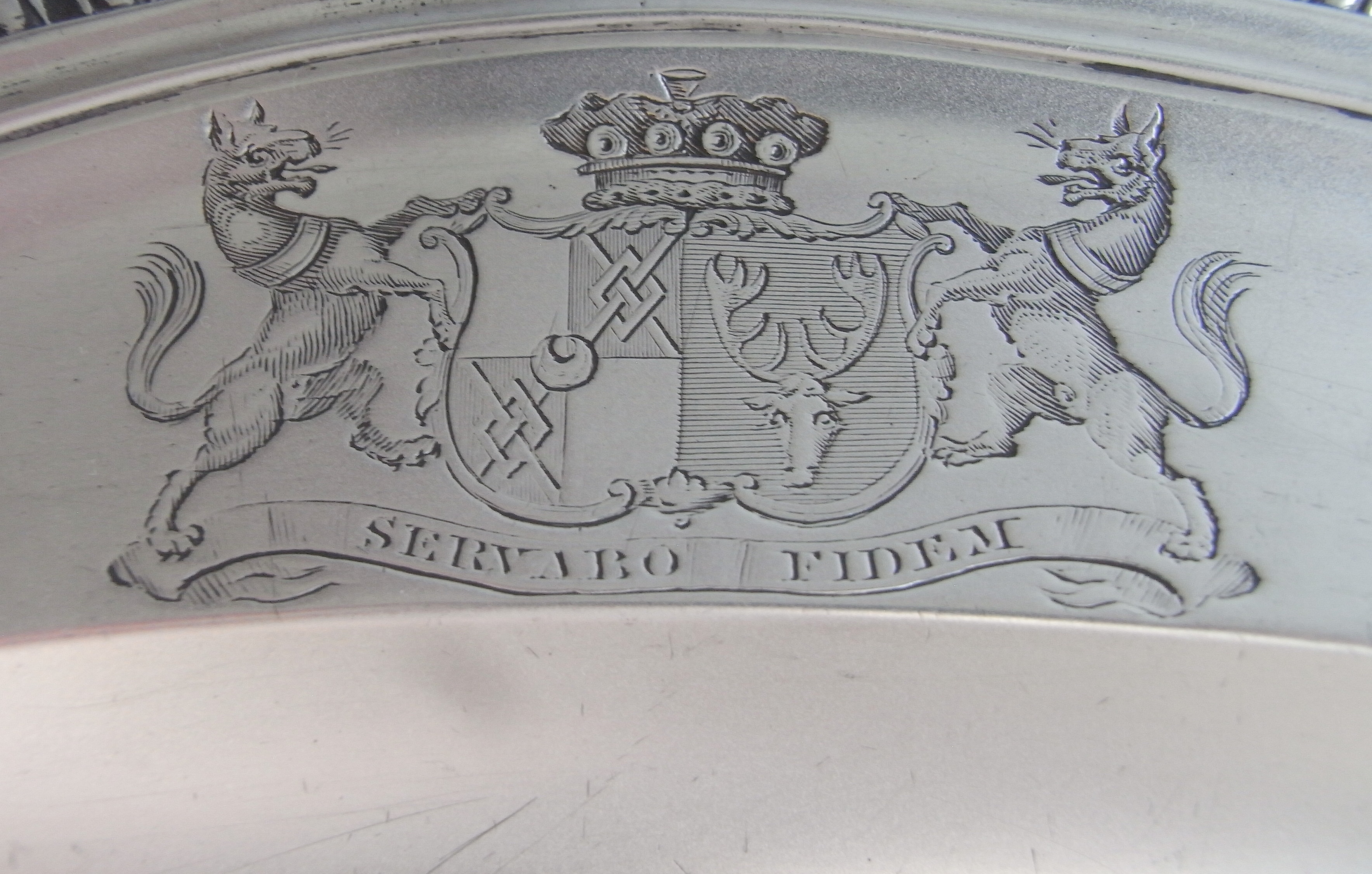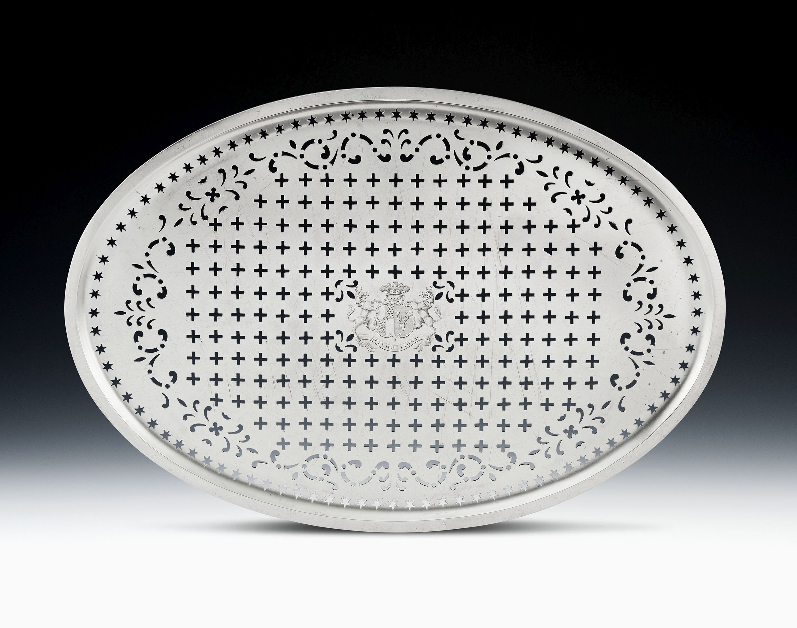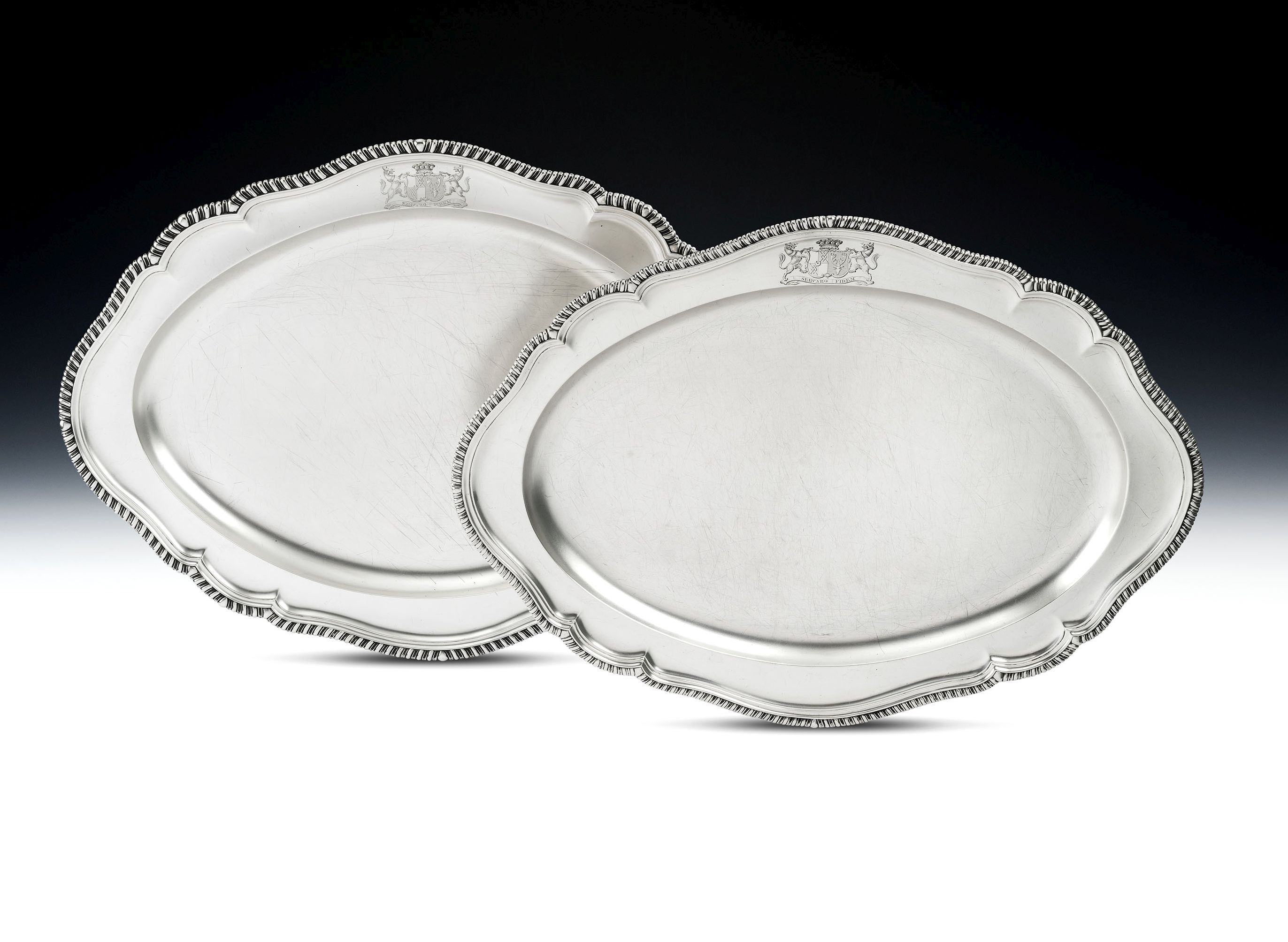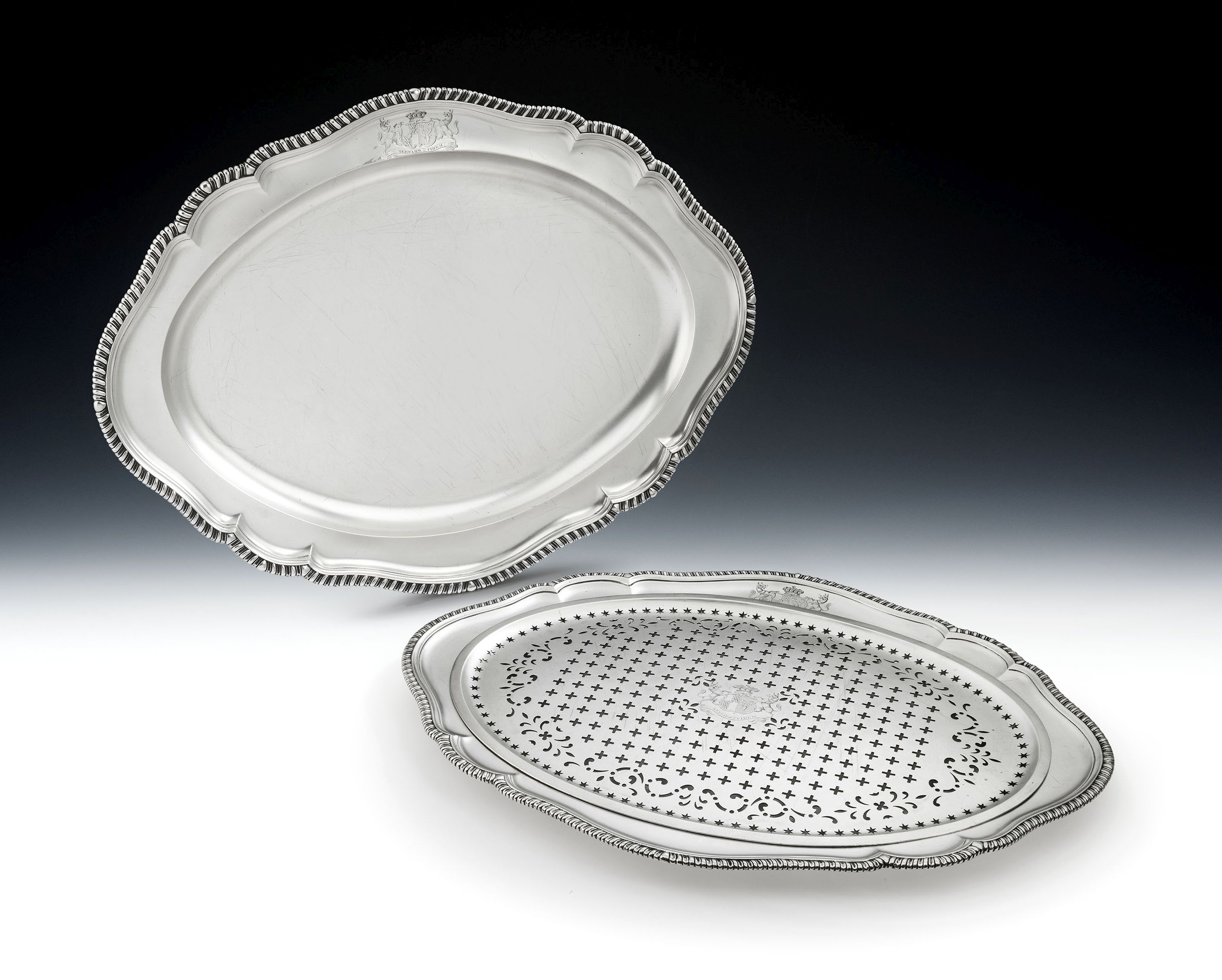 The Dishes are modelled in a shaped oval form with a raised border decorated with bold gadrooning. Each border is engraved with a contemporary Armorial, with Motto engraved on a banner below and the Coronet of a Baron above. This is all flanked by a supporter on each side. The Mazarin is oval in form and is pierced with crosses, scrolls and stars, as well as being engraved with the same Armorial as seen on the dishes. The mazarin was used on the meat dish to allow the juices to flow through, however very few were made and examples with their original dish are scarce. All three pieces are in most excellent condition and are very well marked. Their weight is truly outstanding.