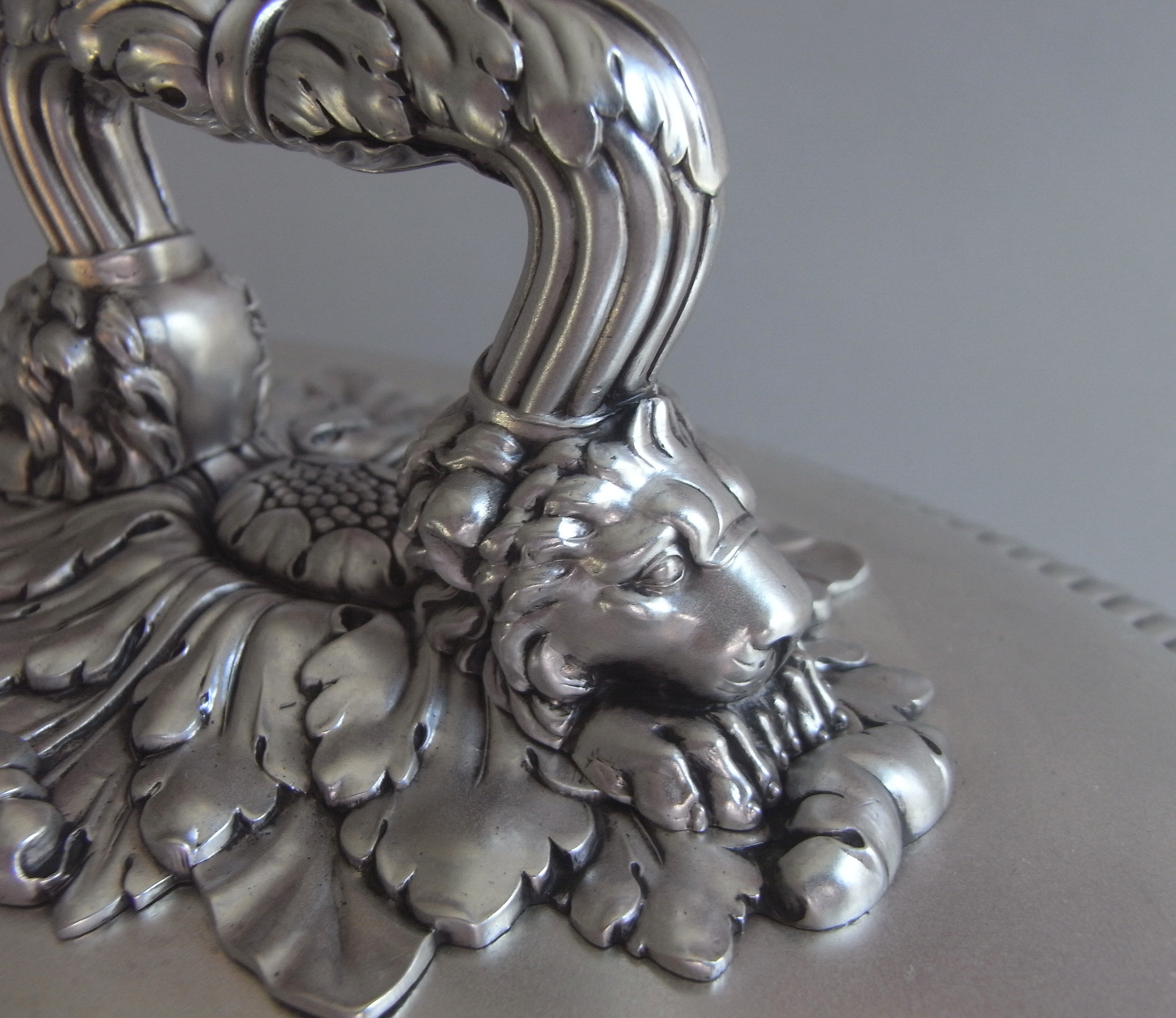 The Tureen stands on a stepped oval foot decorated with a lobed band, which rises to a second lobed band under the body. The main body is modelled in an oval baluster form with a wide band of lobing on the lower section. This rises to an everted rim decorated with gadrooning interspersed with shells flanked by acanthus leaves and anthemion motifs. The bold reeded side handles are decorated with leaf capping and shells and are attached to the main body with acanthus leaf mouldings. The slightly domed, pull-off, cover is decorated with gadrooning and terminates in a beautiful lion head and paw reeded handle, which rests on an acanthus leaf platform centred with a raying flower head. The front and rear are engraved with a contemporary Armorial surrounded by a pluming scroll cartouche and the cover is also engraved on each side with a contemporary Crest. The Armorial and Crest are those of the Calverley family of Ewell Castle and Outon Hall.