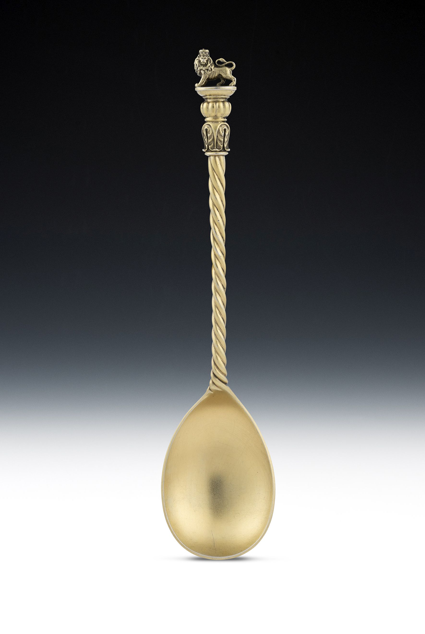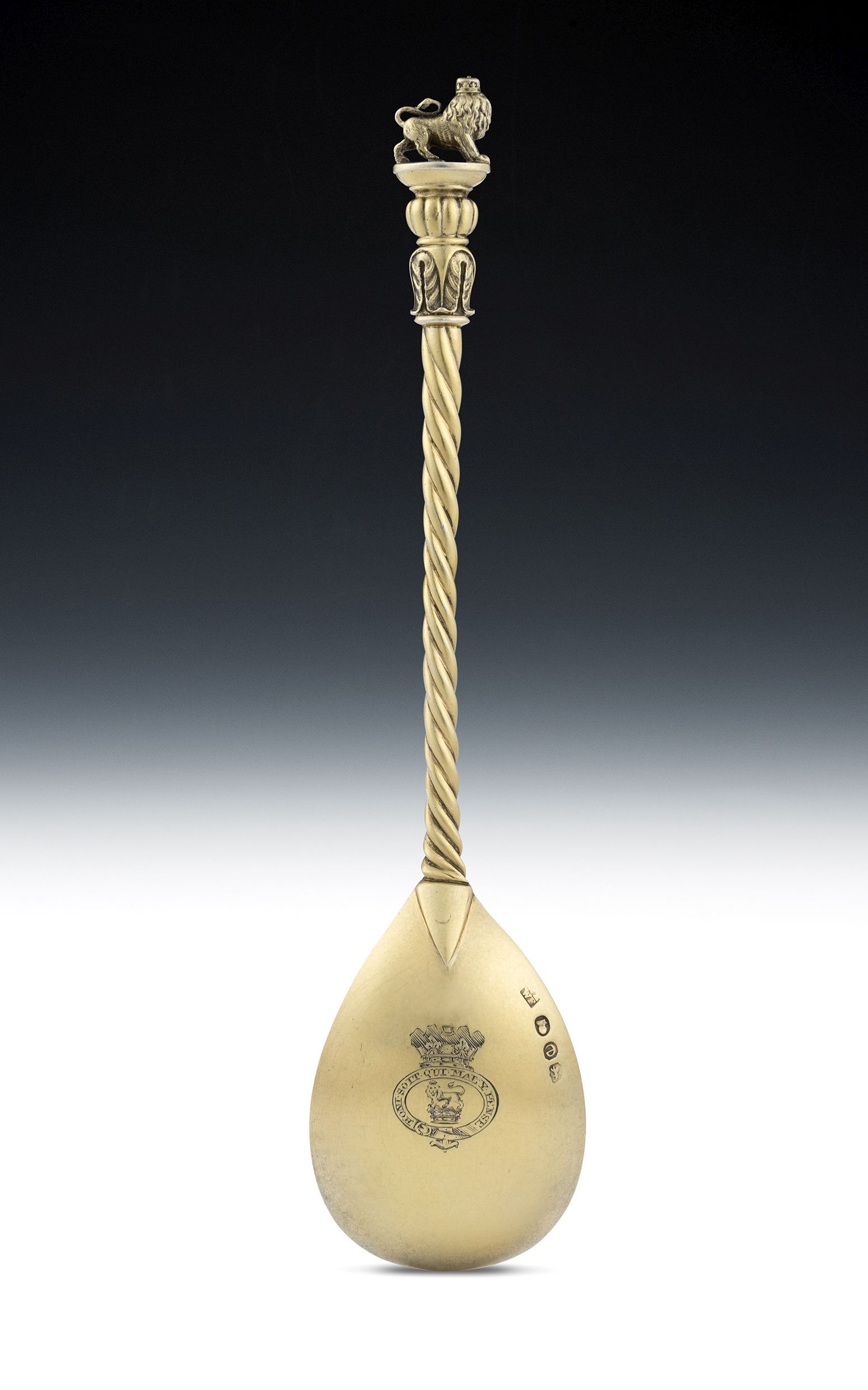 This spoon is a very rare George IV Coronation Spoon which was one of a number which were commissioned, by King George IV, from the fine flatware maker's William Eley & William Fearn in 1820 to celebrate the accession in 1820 and coronation in 1821. As you will see from the images, the spoon is modelled on the 16th and 17th century English seal top spoons and is silver gilt with a fig shaped bowl. It displays a twisted stem and baluster seal top decorated with lobing and cascading foliate motifs below. The top of the stem displays a very finely cast model of the Crest of England, the crowned Lion passant. The reverse of the bowl is engraved with the Crest of Prince Adolphus, 1st Duke of Cambridge, 7th son of King George III and Queen Charlotte. The Spoon is in quite excellent condition and is well marked.
