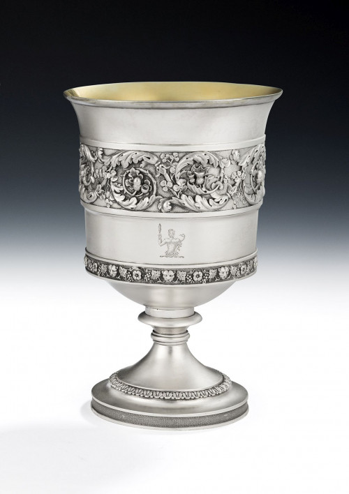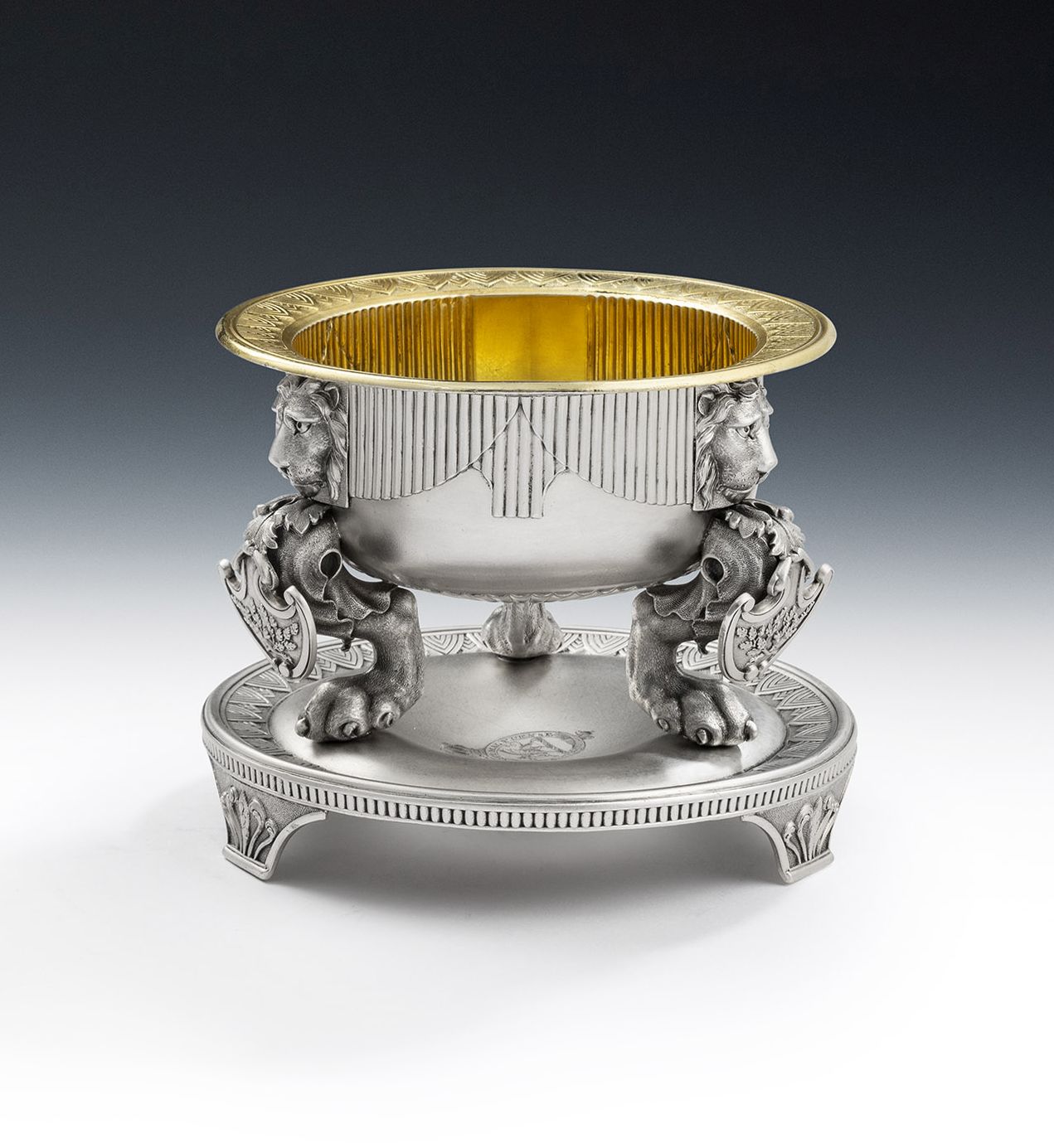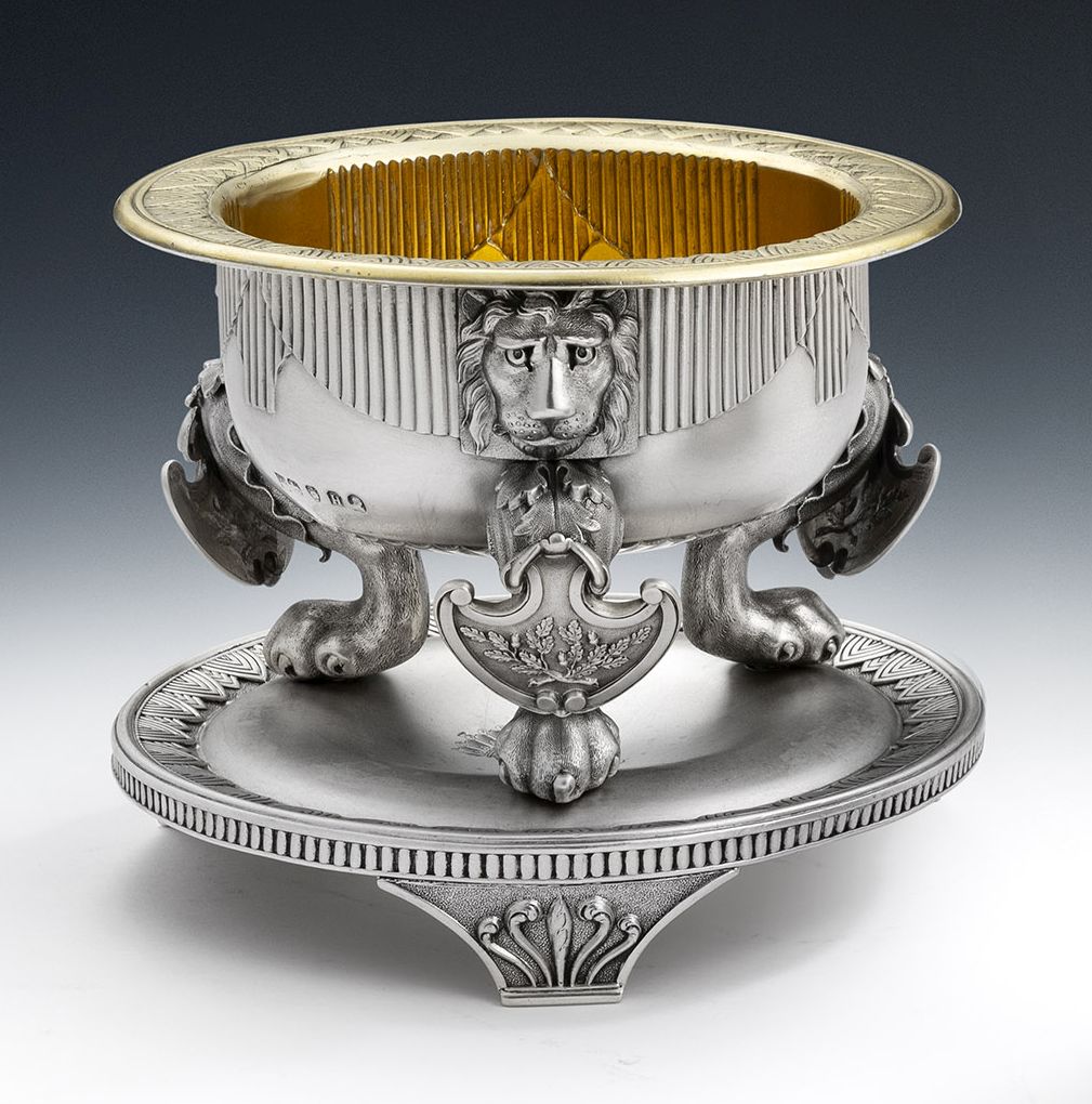 These magnificent vessels are cast and stand on a circular stand with three bracket feet chased with an anthemion against a matted ground. The cellar, above, is bolted in place, and is circular in form with a gilded interior and an everted rim chased with linear palm motifs, identical to the outer border of the stand. The large slightly baluster main body is decorated with unusual linear curtains interspersed with very detailed lion mask mouldings and lion paw feet, the surface textured to simulate the fur of the lion. The legs each display a shield of crossed oak branches and acorns. The top of the domed platform is engraved with a Crest, with the Coronet of an Earl above and the Crest surrounded by a garter engraved with the Motto of the Order of the Garter. The cellars are fully marked on the underside and on the side of the cellar. All are in excellent condition and are of an exceptionally heavy weight. Both are also stamped under the base "RUNDELL BRIDGE & RUNDELL AURIFICES REGIS ET PRINCIPI WALLAE LONDINI FECERUNT".