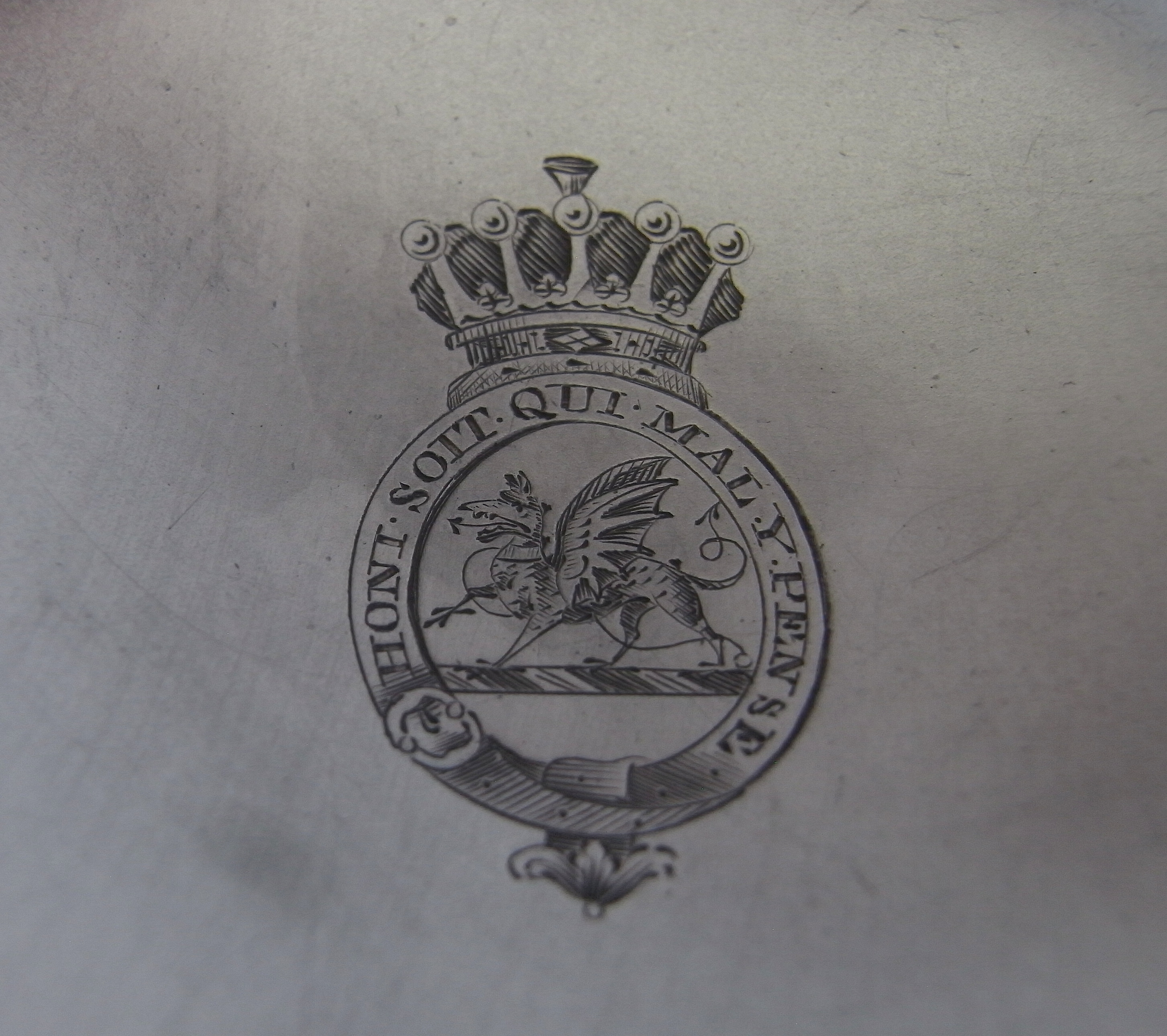 The crest is that of William, Viscount and Baron Lowther (1757-1844), created 1st Earl of Lonsdale in 1807. He married Augusta, eldest daughter of John, 9th Earl of Westmorland, in 1781. The Earl was a significant patron of the arts and commissioned the rebuilding of Lowther Castle. He was one of the great patrons of plate in the Regency era, including owning one of the Shields of Achilles (now at Anglesey Abbey, National Trust).