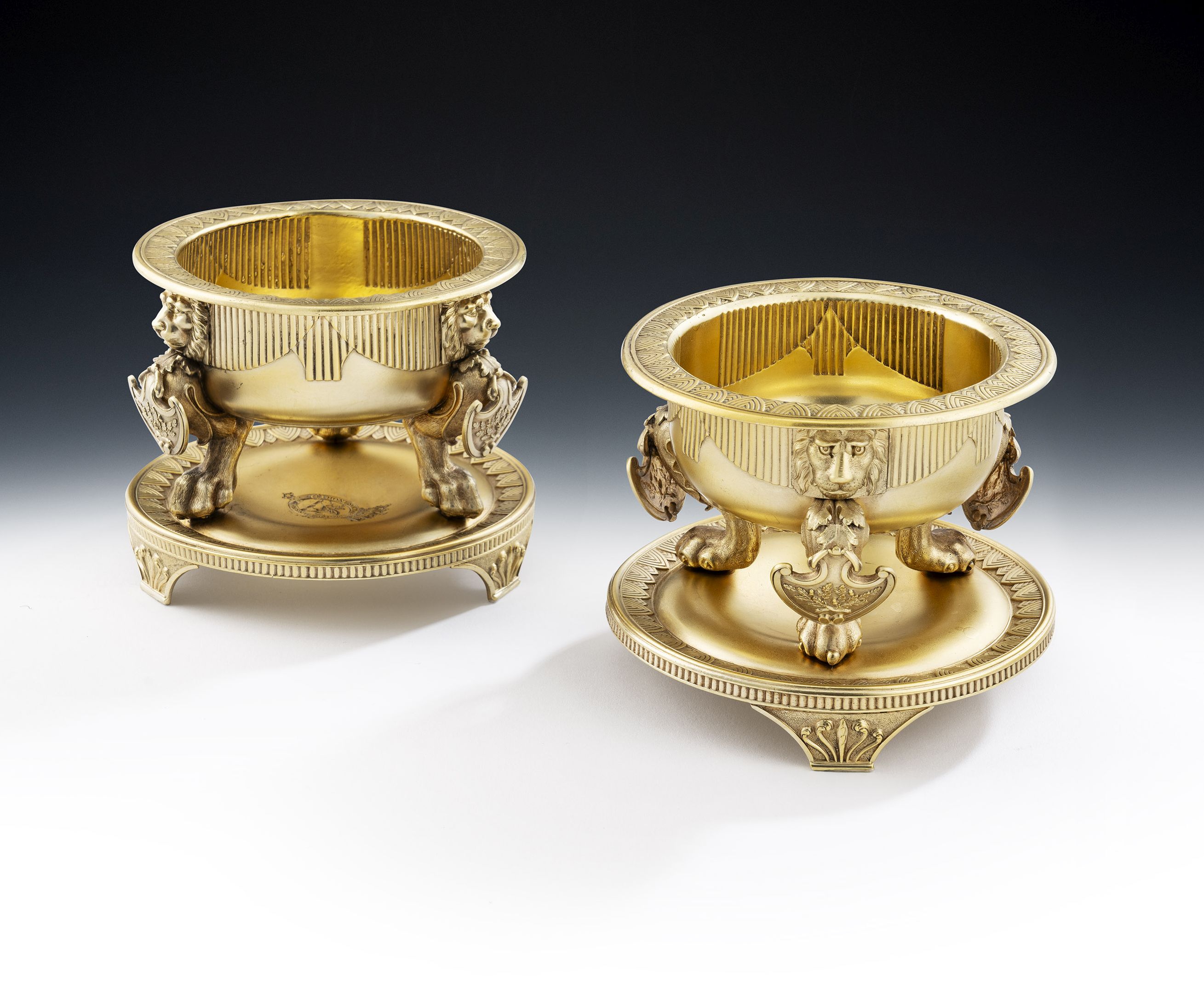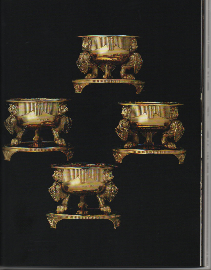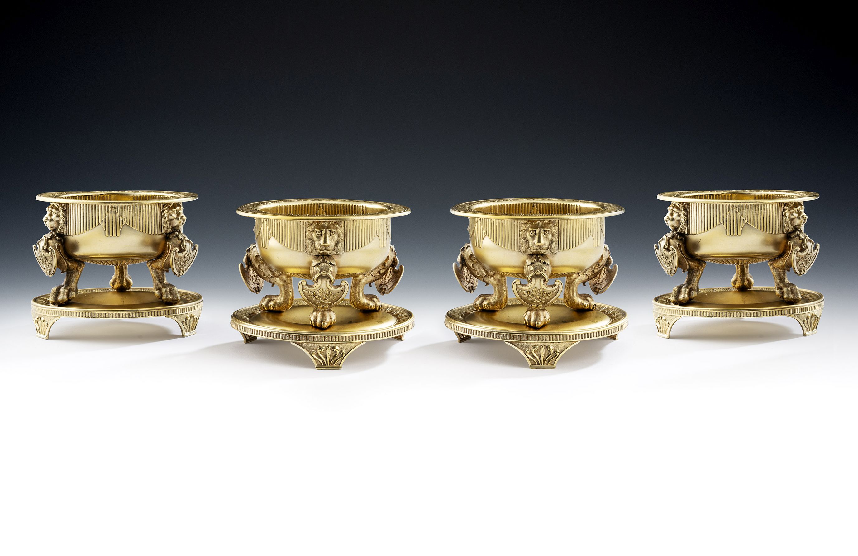 The present group of four salt cellars was originally part of a group of twelve, hallmarked for 1803, 1804, 1808 and 1810, which was dispersed in the Lonsdale sale in 1947. They can be compared to a group of 36 salt cellars in the Royal Collection, designed in an even more pronounced Egyptian taste with sphinx heads (RCIN 50821). These, part of the 'Grand Service', were produced by Digby Scott and Benjamin Smith, and Philip Rundell, between 1802-19 (see Carlton House: The Past Glories of George IV's Palace, 1991, p. 131, no. 92). Another set, with lion head and shield supports by Benjamin and James Smith of 1810, sold at Christie's, London, October 23, 1991, lot 47.