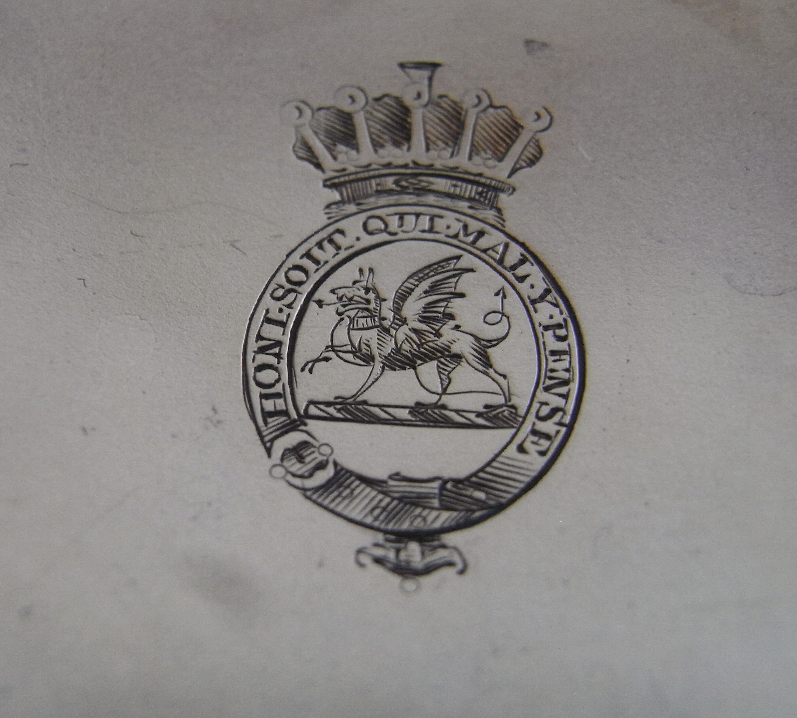 The crest is that of William, Viscount and Baron Lowther (1757-1844), created 1st Earl of Lonsdale in 1807. He married Augusta, eldest daughter of John, 9th Earl of Westmorland, in 1781. The Earl was a significant patron of the arts and commissioned the rebuilding of Lowther Castle. He was one of the great patrons of plate in the Regency era, including owning one of the Shields of Achilles (now at Anglesey Abbey, National Trust).
