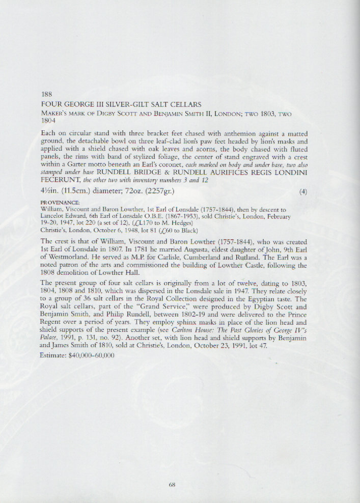 These Salt Cellars were part of the fabulous Collection of Regency Silver belonging to Alan & Simone Hartman, which was sold by Christie's in New York in October, 1999. They formed lot 188 and the catalogue entry is shown. They are offered at a very good price, as the estimate in 1999 was $ 40,000-$60,000, the set.