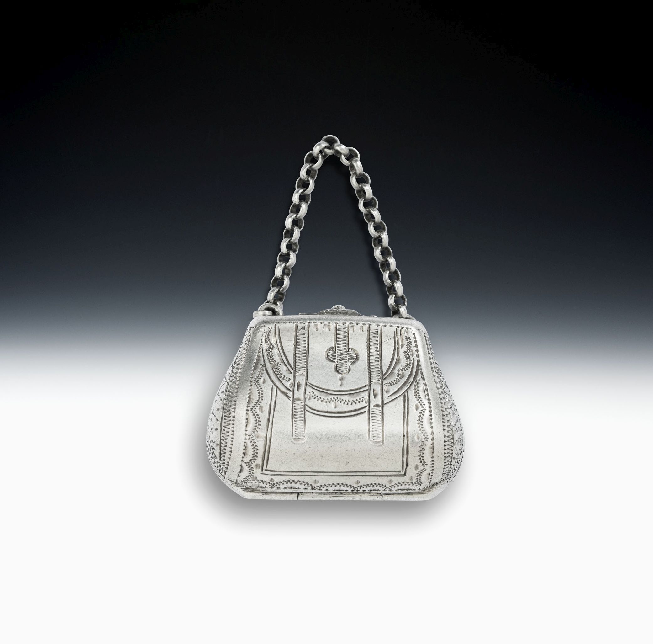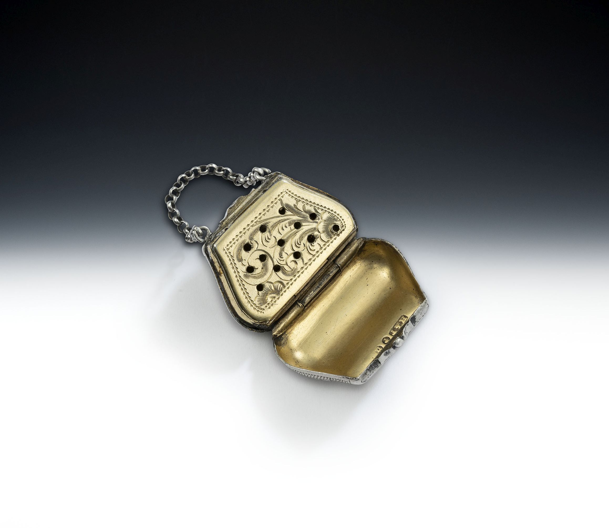 This rare piece is finely modelled as a "Handbag" and is beautifully engraved with prickdot and bright cut designs including flower heads and linear designs. The box opens up to reveal fine interior gilding and a grille engraved with pluming scrolls and flowerheads. The grille is also pierced with plain roundels. Handbag Vinaigrettes do not appear often today and this is in excellent condition and is of the finest quality in terms of both design and production. The interior is very well marked on both the cover and base.
