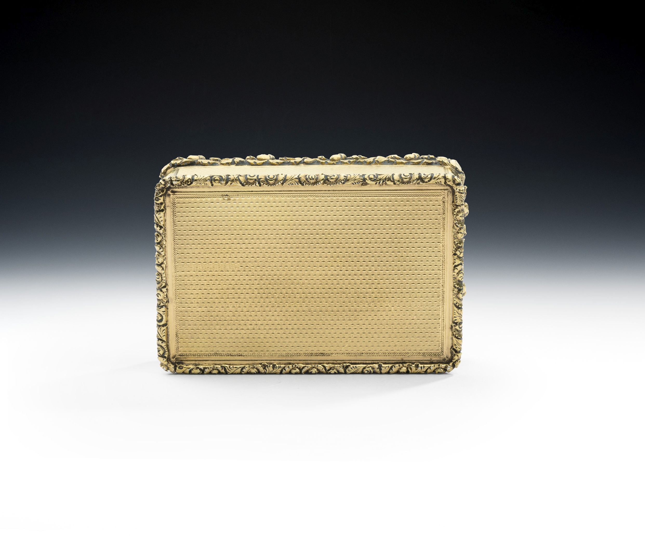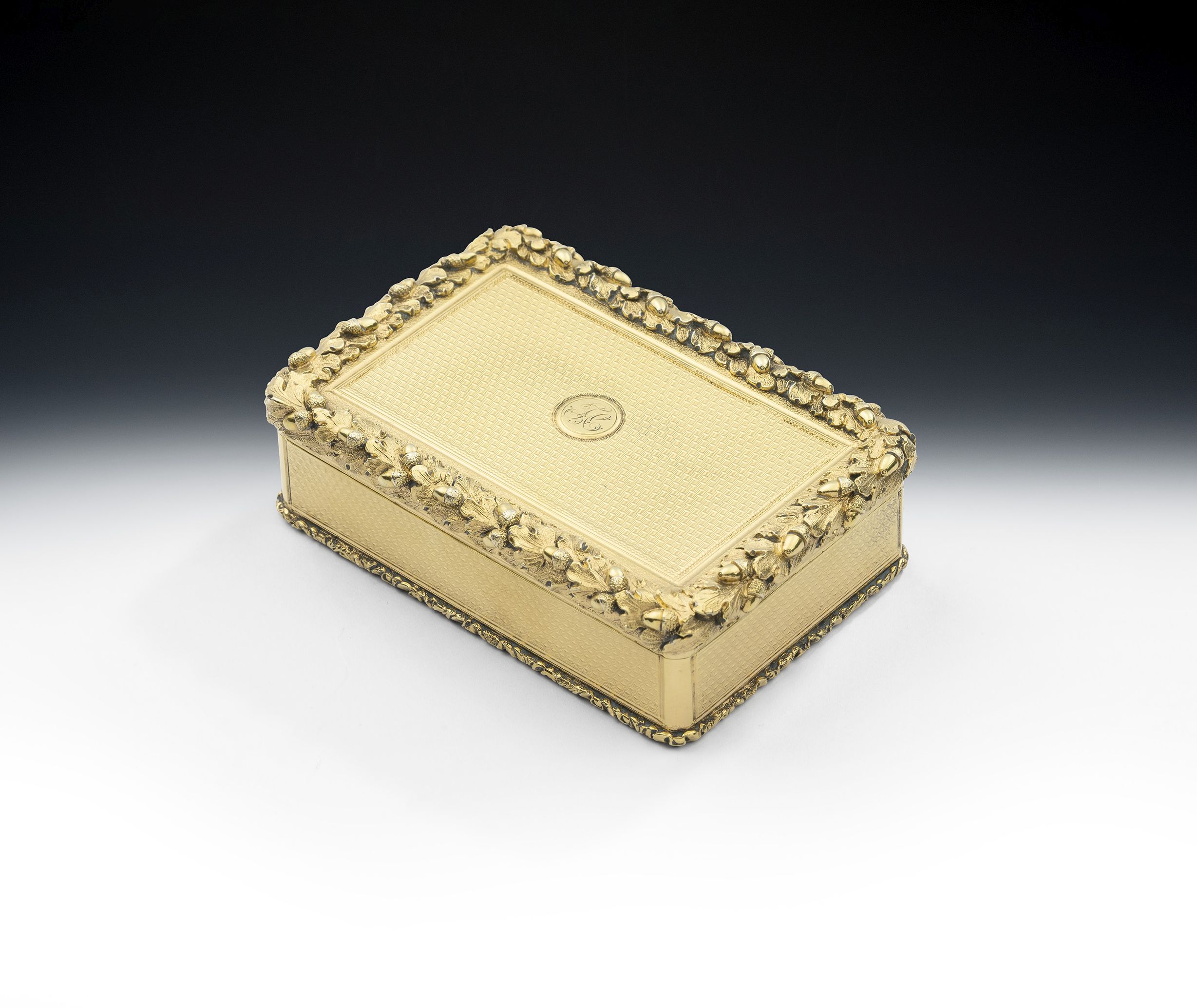 This very fine Table Snuff Box has a deep broad rectangular form. The sides and base are decorated with engine turned designs and the base displays a foliate scroll and flower head frame. The hinged cover is also decorated with engine turned designs around a circular button cartouche engraved with a set of contemporary script initials. The edge of the cover displays a wide, finely detailed, band of raised oak leaves and acorns. This box is in excellent, crisp, condition and is very well mark in side in the base and on the underside of the cover. The interior gilding is also in excellent condition.