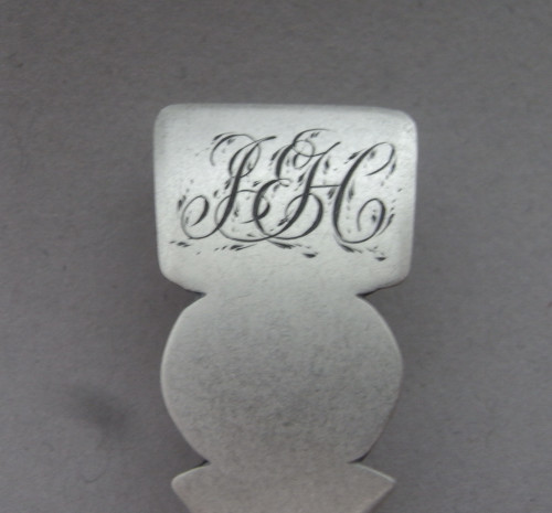 The Caddy Spoon is modelled in the rare early bi-furcated design and displays a scallop shell bowl and bright cut engraved bi-furcated handle, with bright cut shoulders where it is joined to the bowl. The top of the stem is engraved with a shield shaped cartouche, which contains contemporary script initials. This spoon came from the most famous Caddy Spoon Collection of all time, the John Norie Collection, and is illustrated in "Caddy Spoons" by Captain John Norie, Plate 2, Figure e This piece is in excellent condition and is very well marked on the reverse of the stem.