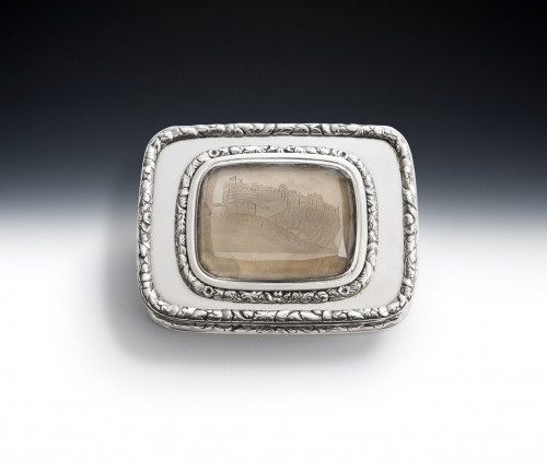 This very rare parcel gilt Aide Memoire has a slightly tapering rectangular form, with hinged cover. The bright cut zig-zag borders enclose trellis work panels and ovals containing very unusual Gold Neo Classical Urn motifs, with male mask motifs on each side. The top of each side also displays a gold banner, one side engraved with D'Amitie and the other with Souvenir. The top of the cover is also engraved with Thomas Eyre, obviously the original owner. The cover opens up to reveal a compartment for a pencil and ivory leaves. This piece is in excellent condition and is a very rare example from this period, especially being parcel gilt and gold and modelled in the Neo Classical tradition.