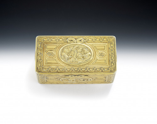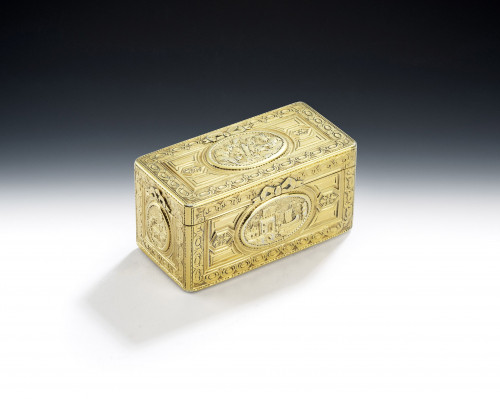 The Toothpick Case is narrow rectangular in form with rounded ends. The base, sides and cover are engraved with engine turned designs around plain frames. The cover also displays a vacant cartouche. The interior is very well marked and displays its original mirror. A very fine box, by an unusual maker, of the finest quality and in excellent condition.