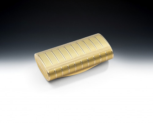 The Snuff Box is of an unusual smaller size and was most probably for the use of a Lady. The cover and base are inset with a slightly domed cornelian stone, with an outer gold reeded frame. The plain gold sides are also decorated with a single reeded band. The box is in excellent condition.