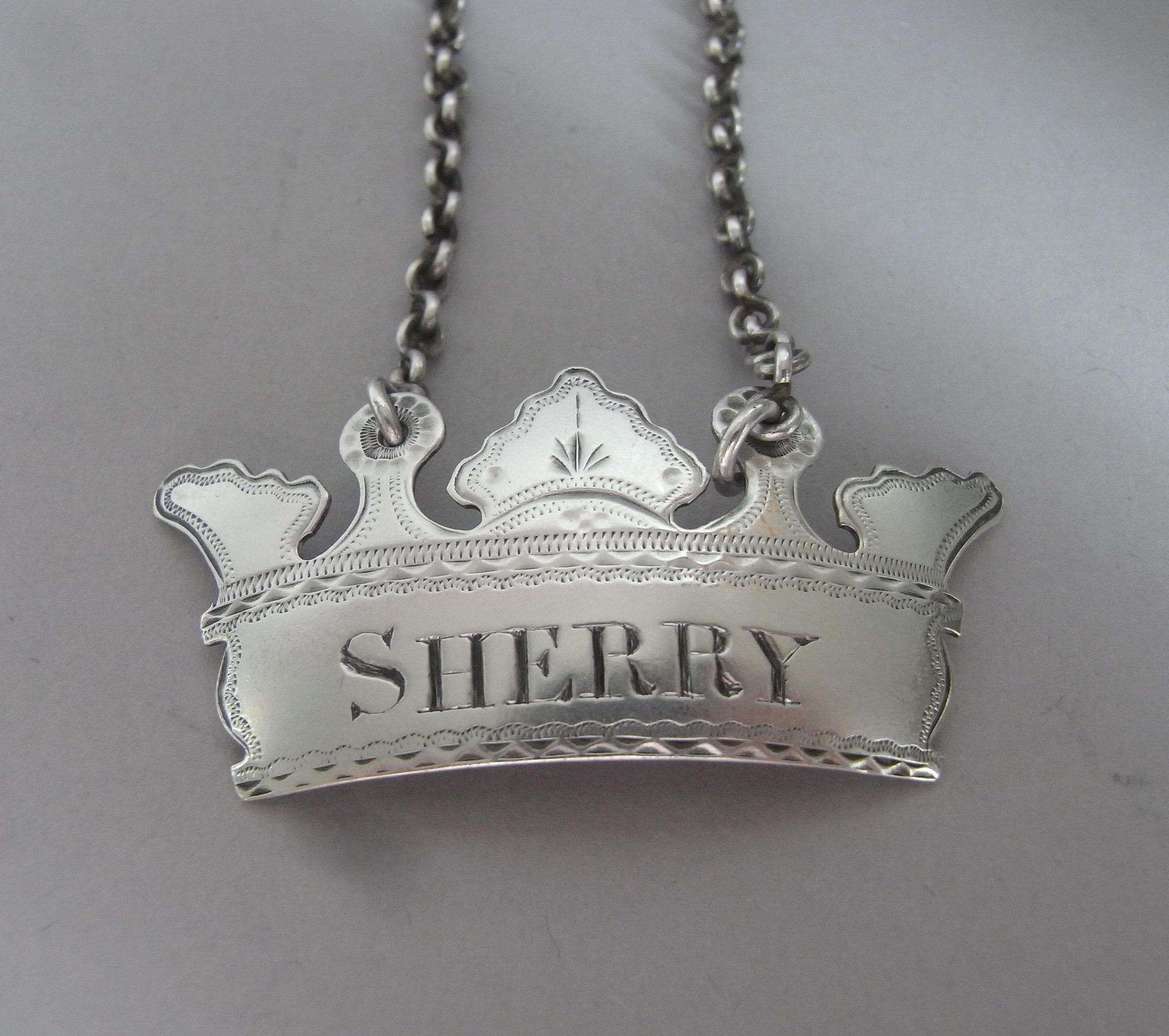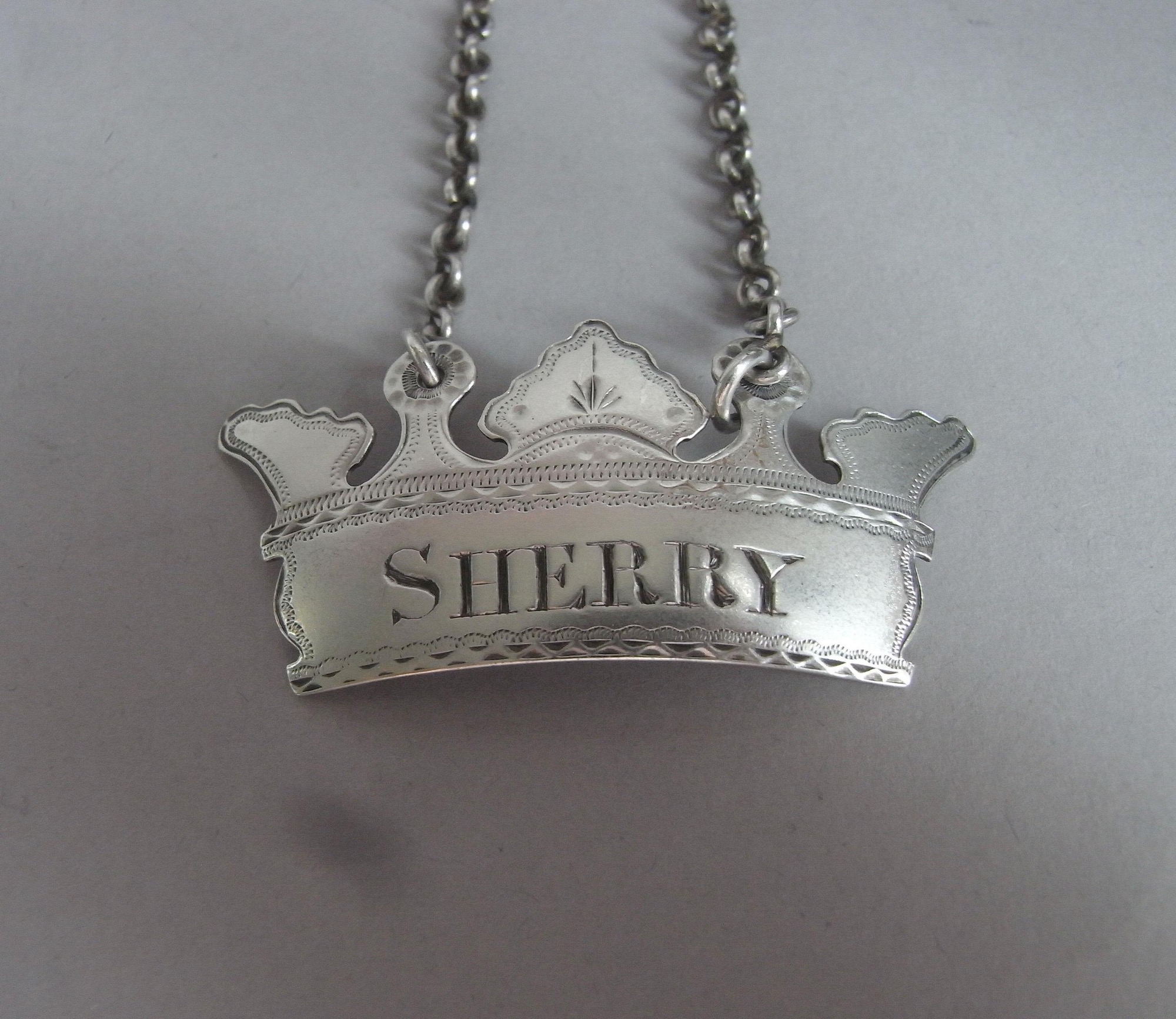 The Label is designed to simulate the Coronet of a Marquis, based on the two balls and three strawberry leaves incorporated into the Coronet of a Marquis. The face of the label is engraved with an eclectic mix of pretty bright-cut, prick dot and reeded borders. This piece is engraved for SHERRY, is well marked on the reverse and is in excellent condition.
