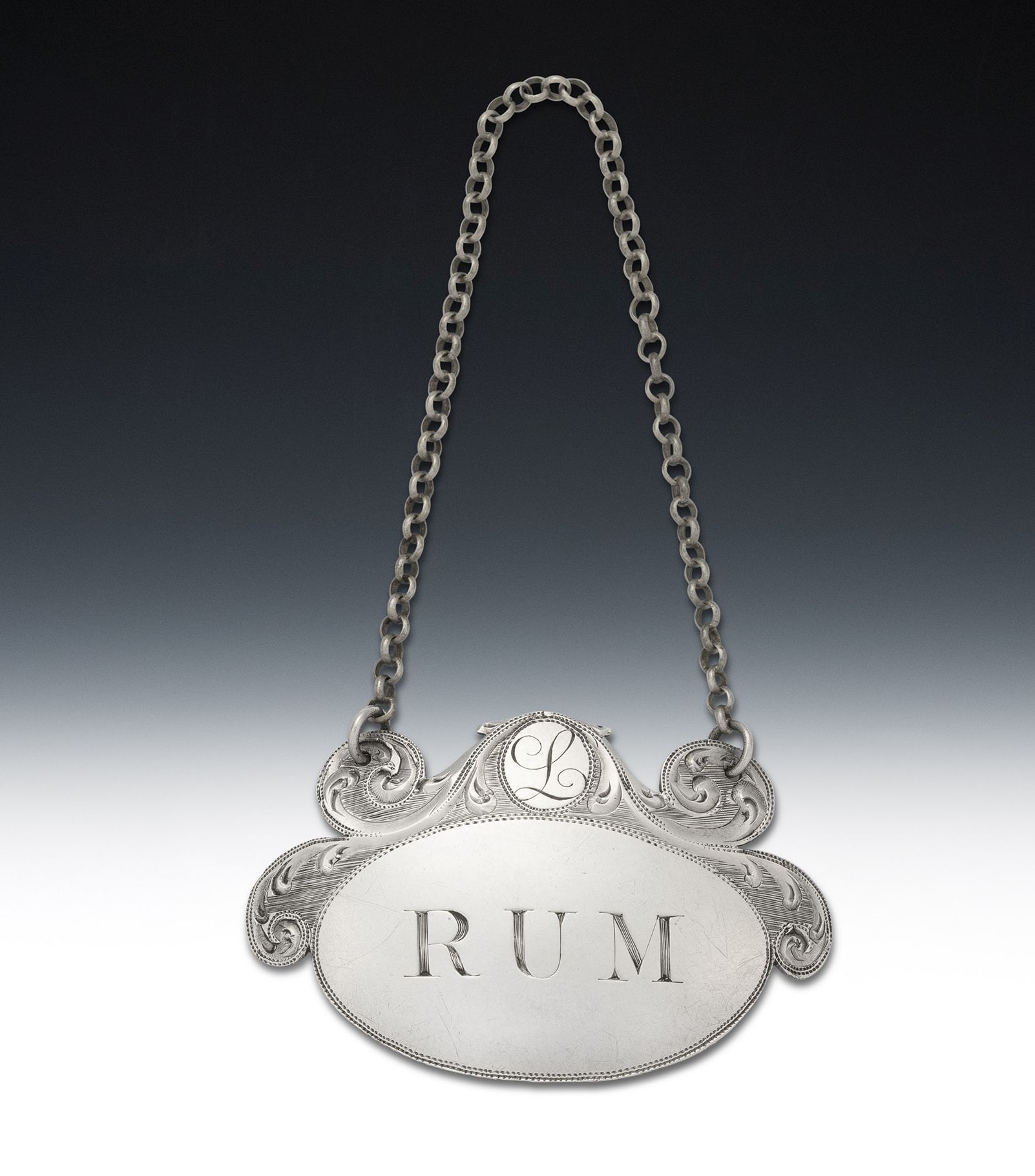 The Label is modelled in an unusual design with oval face engraved with the title RUM. The top of the label displays pluming, feathery, scrolls and a liner ground, flanking a central cartouche engraved with the contemporary initial "L". This piece is in excellent condition and an identical label from this set is shown in "Wine Labels - 1730-2003 - A Worldwide History, Page 58". This piece is well marked on the reverse.